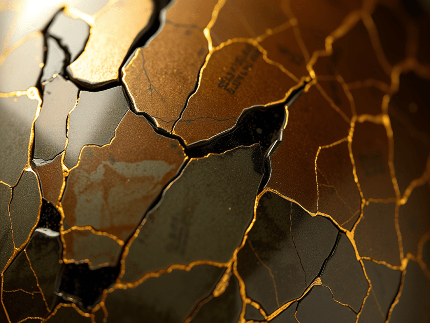 Kintsugi is the Japanese art of repairing broken pottery by joining pieces back together and filling cracks with lacquer dusted with powdered gold, silver, or platinum, thereby highlighting the flaws in the mended object.