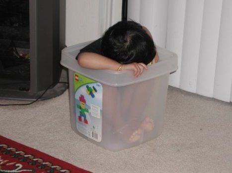Keep the pressure on, and see the kind of spots they come up with to really enjoy hide-n-seek. For example, this is where I “found” my daughter hiding when I came home one day. I had to try to avoid tripping over her, given that the box was in the middle of the room. Nevertheless, I spent five whole minutes shouting out her name, and looking for her in every other room, before feigning surprise at find her here.